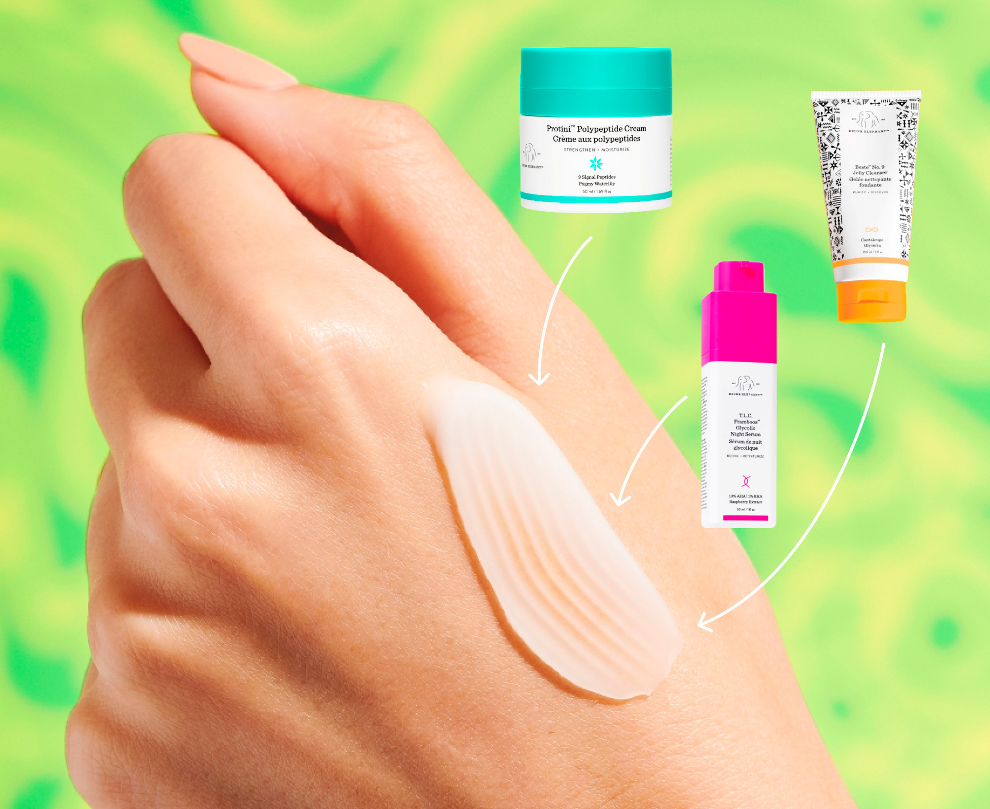 А для тех, кому одной теории о биосовместимости маловато, у Drunk Elephant есть и приятная практика — концепция смузи! Продукты бренда можно смешивать между собой (прямо на ладони или даже во флаконе) или наслаивать — по два, четыре, да сколько душе угодно. Так вы сами регулируете текстуру и насыщенность ухода, создавая свой уникальный флюид-сыворотку или крем-маску.