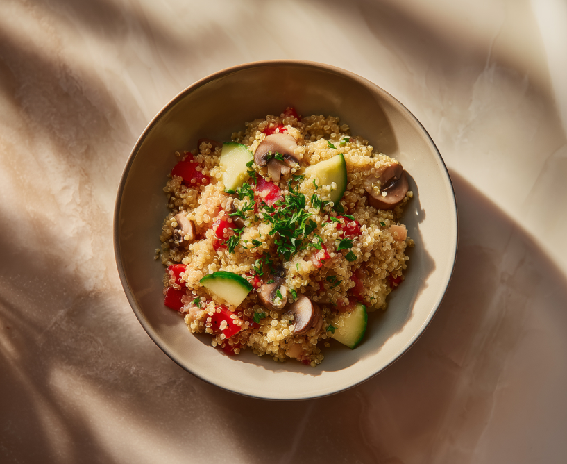 Крупа киноа — незаменимый ингредиент для постного стола. Диетологи считают её идеальным растительным белком, так как в ней много протеина и содержатся все незаменимые аминокислоты. Дополнительным источником белка станут грибы, а свежие овощи обеспечат организм витаминами и клетчаткой. Это блюдо можно подать на гарнир, но на самом деле оно такое сытное и вкусное, что заменит полноценный приём пищи.