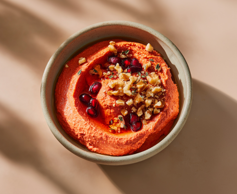 «Мухаммара» — популярная ближневосточная закуска. В оригинальном рецепте её делают на основе красного острого перца. Однако если приготовить её со сладким болгарским перцем — это постное блюдо приобретёт новые вкусовые оттенки. Пасту можно намазывать на хлеб или тосты, обмакивать в неё постные лепёшки, использовать в качестве соуса ко вторым блюдам.