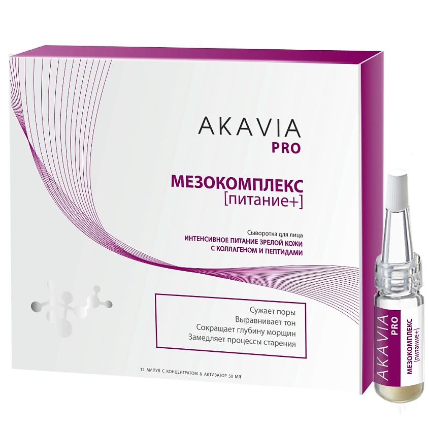 Уходовая косметика для лица АКАВИЯ создана с применением технологий липосомирования и лиофилизации, содержит активные компоненты высокой концентрации без применения консервантов, стабилизаторов, силиконов, минерального масла. Липосомированные активные компоненты полностью проникают в глубокие слои кожи, эффективно и безопасно действуют, не разрушая эпидермис, восстанавливают и укрепляют защитный слой кожи. Пептидная сыворотка для лица AKAVIA PRO с гиалуроновой кислотой и коллагеном состоит из двух фаз: сухой («КОНЦЕНТРАТ») и жидкой («АКТИВАТОР»). Безводная форма выпуска (freeze dried) защищает активные компоненты от окисления, сохраняет их структурную целостность и биологическую активность. При смешивании двух фаз получается концентрированная омолаживающая сыворотка для лица с активными действующими веществами, которая глубоко проникает в кожу и работает на клеточном уровне.